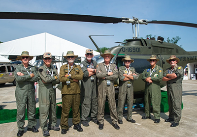 Above, members of the North Carolina Vietnam Helicopter Pilots Association pose in front of one of their four Vietnam War vintage helicopters at Camp Legacy on the National Mall during the Vietnam War Commemoration's "Welcome Home! A Nation Honors Our Vietnam Veterans and Their Families" (photo courtesy of the Vietnam War Commemoration). Below, veterans of the Red Cross Supplemental Recreation Activities Overseas program, popularly known as Donut Dollies, join umpires and coaches at home plate during "Welcome Home Vietnam Veterans" ceremonies at Nationals Park before a game between the Washington Nationals and New York Mets (photo courtesy of the Washington Nationals).